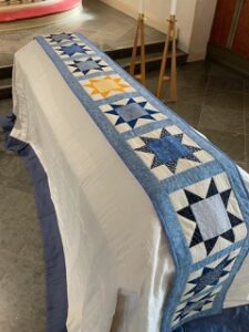 Det består av en bård med stjärnor i blå nyanser med en gul stjärna i mitten. Det är i lapptäcksteknik. För mer information kontakta Gull Andersson, tel: 0761-697025.